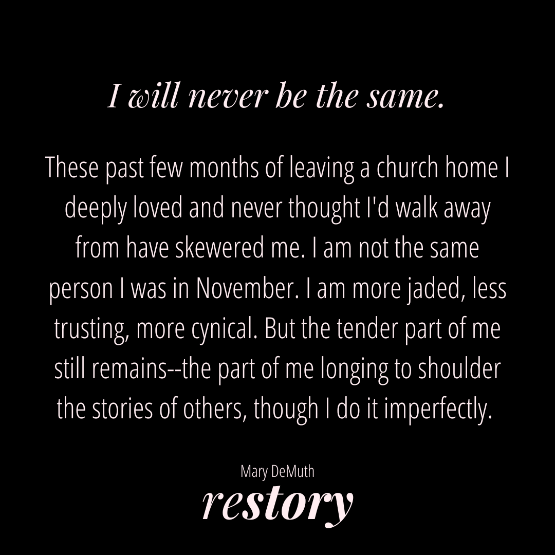 These past few months of leaving a church home I deeply loved and never thought I’d walk away from have skewered me. I am not the same person I was in November. I am more jaded, less trusting, more cynical. But the tender part of me still remains–the part of me longing to shoulder the stories of others, though I do it imperfectly.